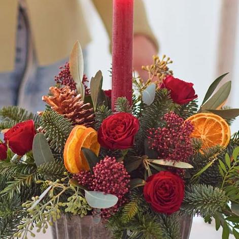 A gorgeous selected of fresh festive flowers, arranged by a florist around a red candle, in a dark copper coloured ceramic bowl.