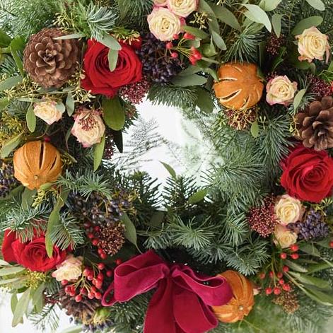 A luxurious take on our classic wreath, it'll feature more (or more luxurious) blooms. One to wow it'll feature stunning fresh blooms and foliage. Expect shades of red and green, with peach and cream highlights and pops of burgundy and cerise.